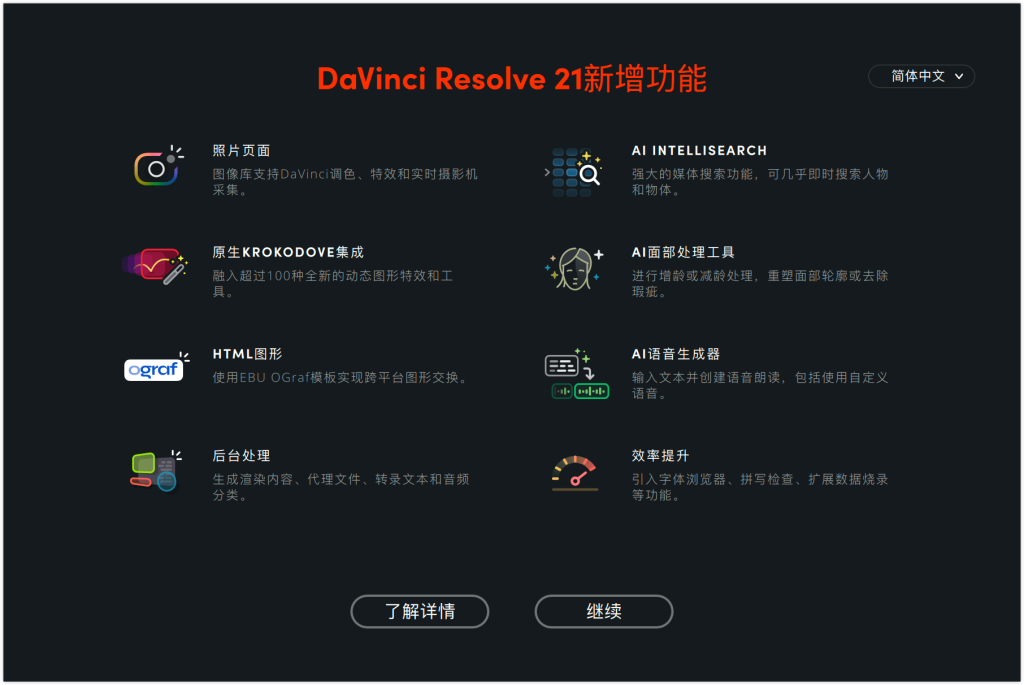 DaVinci Resolve Studio 21推出照片页面,将好莱坞级别的高级调色工具带给调色师和平面摄影师来处理照片!此外还有超过100种新的动态图形特效,50项新功能和数百项性能改进。新的AI工具包含用于快速内容搜索的IntelliSearch,用于焦点调整的CineFocus和面部精修工具等。快编和剪辑页面改进了关键帧处理并增加了更多图形格式支持。Fusion包含Krokodove工具集,拥有70多种新图文,Fairlight的文件夹功能简化了音频轨道管理。MultiMaster调色方案、图层列表节点图和群组版本强化了调色页面的工作流程。
